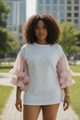 This chic oversized tee style dress delivers comfort and confidence with a couture twist. Designed with dramatic tiered ruffle sleeves in soft pastel tones, it adds the perfect pop of femininity while staying modern and minimalist. Crafted with a smooth, breathable fabric, this dress moves you making it ideal for brunch dates, shopping days, events, or stylish everyday wear. Dress it up with heels or keep it casual with sneakers the versatility is endless.